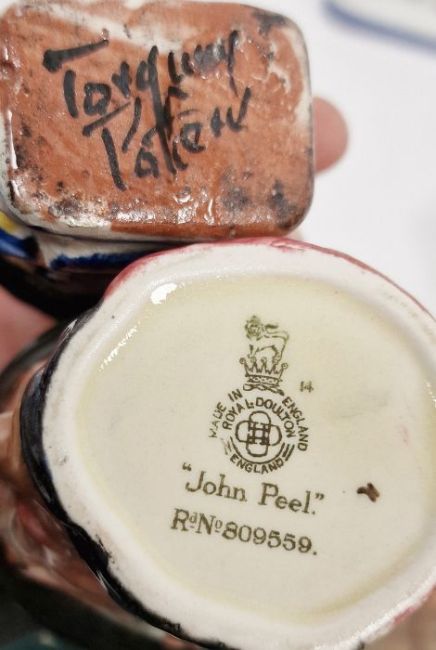 Assorted English pottery character jugs, comprising a Royal Doulton John Peel small jug, printed RD 809559, a Lancaster Sandland characterware mug, inscribed Tally Ho, a Staffordshire pottery toby jug, damaged, and a Torquay pottery miniature toby jug, two Rye Pottery Canterbury Tales figures comprising The Merchant, 24.5cm high, and The Yeoman on horseback, and a Rye Pottery group of running greyhounds, all on blue lined bases, and a Royal Worcester fluted sugar bowl, various marks (8)