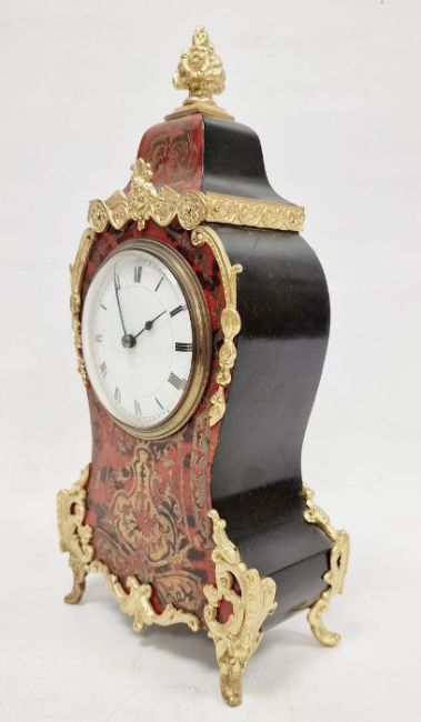 19th century French boulle-fronted mantel clock of revived rococo style, in balloon-shaped case with high dome surmounting and topped by gilt bronze finial of fruit, having circular white enamel dial, all with gilt bronze rococo scroll mounts and on four tab feet, 33cm high