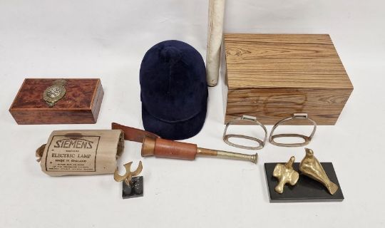 Group of assorted collectables including Herbert Johnson (London) blue velvet clad riding helmet, a pair of stirrups, two gilt bronze Bemaki Musuem, Athens, replicas of eagles/birds, a burrwood cigarette box with gilt metal plaque inscribed '17th Lancers' and other items Condition ReportReport request: Is the horn stamped? (only)No obivious stamp.