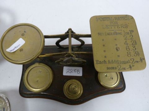 Postal scales with weights, a Walker & Hall silver plated teaspoon, loose flatware  etc