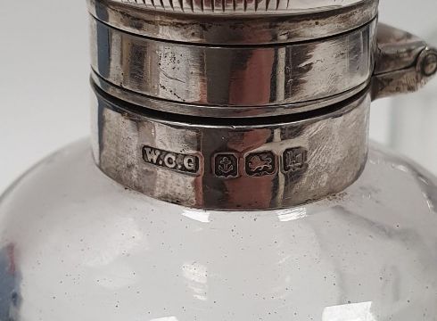 Early 20th century silver-lidded and glass bottle, Birmingham 1909, a silver-mounted and glass vase (bent and worn) and a silver-coloured metal mounted flask (3)