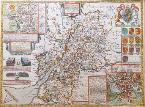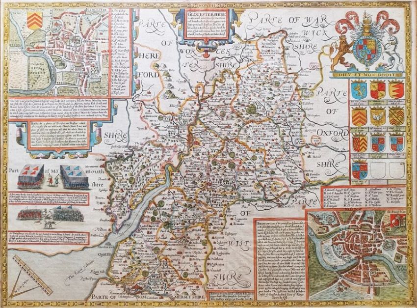 After John Speed (1552-1629)Hand coloured and engraved map of Gloucestershire, with inset maps and armorial bearings, framed and glazed, 39cm x 51cm