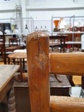 Possibly early/mid 20th Century. Surface scratches, scuffs, knocks and some minor splits to the wood. Wear and fraying in some areas on the rush seats. Accretions, spots of white paint, fading and discolouration. General wear and tear