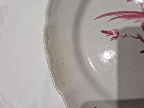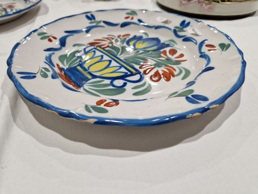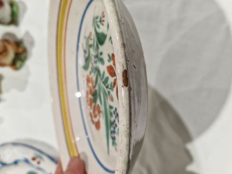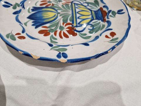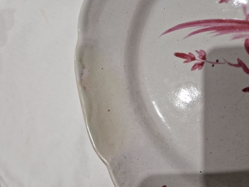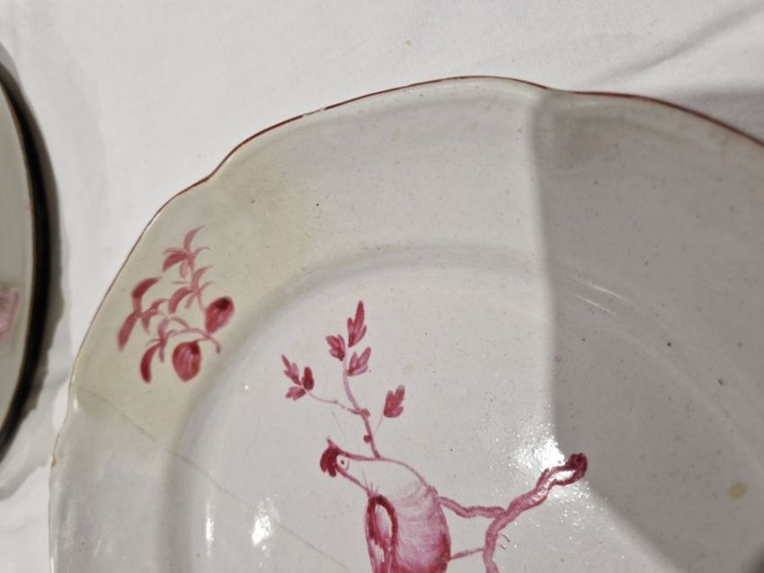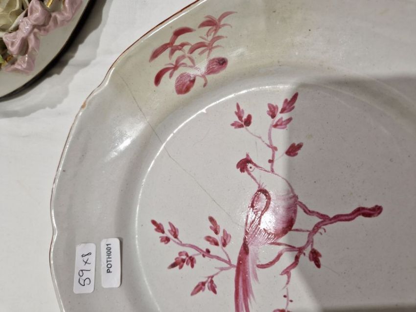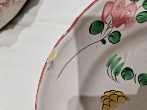 Surface scratches and accretions. Some plates and bowls with chips. Bird plate with crack and old repairs. General wear and tear