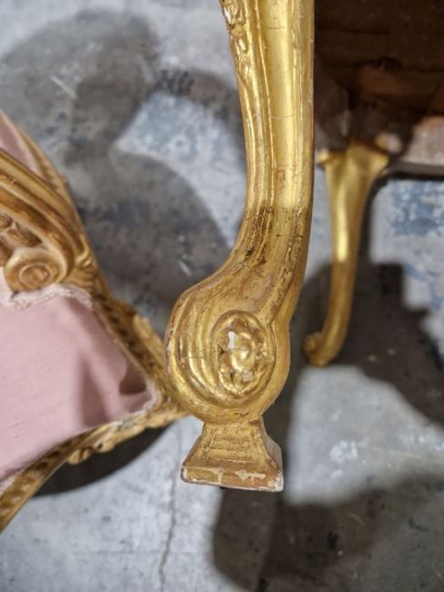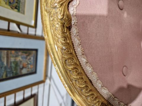 Pair of 19th century Adam-style gilt salon chairs, with foliate scroll and guilloche floral button back, scroll arms, nulled frieze, pink upholstery, on pierced scroll cabriole supports (possibly from Syon House)
