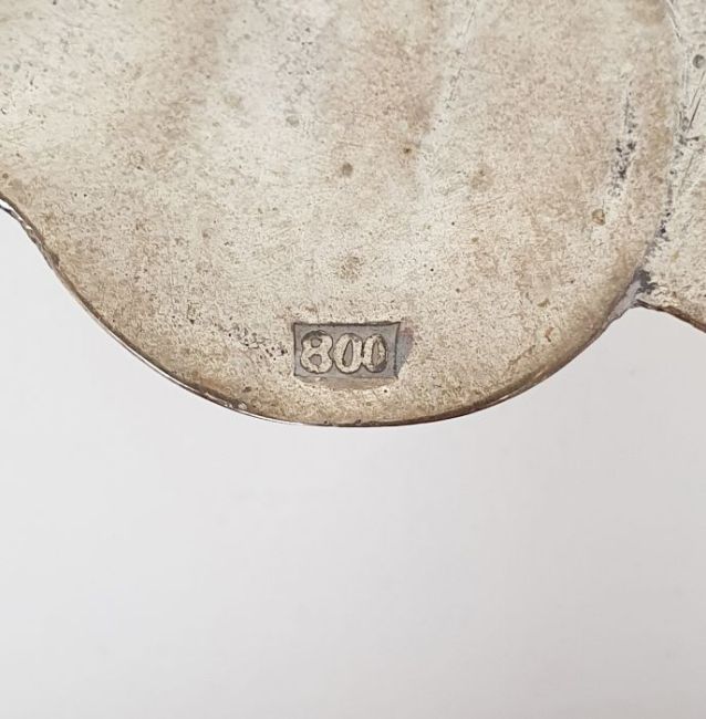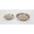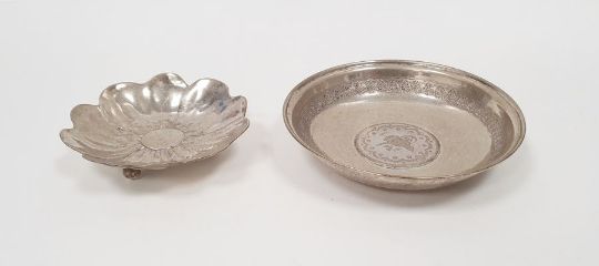 Foreign silver poppy-shaped dish marked '800', 1ozt approx., 7.5cm diameter. and a silver-coloured circular dish with arabic decoration, 10cm diameter (2)