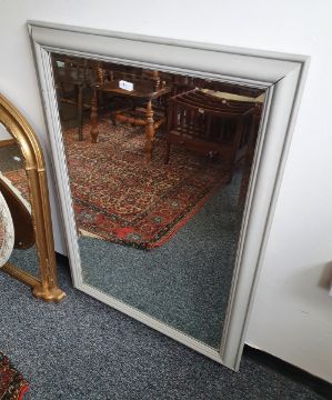 Modern gilt painted overmantel mirror, a grey painted oval mirror and a modern grey painted rectangular mirror with bevelled edge (3)