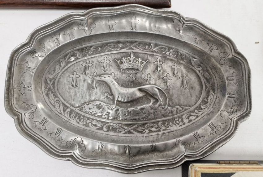 Red leather and gilt decorated book slide, a miniature Common Prayer and Hymns, published by William Clowes & Son full green leather , with gilt titles and red/gilt edges within a leather fitted slip case., postal scales, vintage cased razors, a pewter dish with an embossed crest, a leather stiff collar case and other collectables