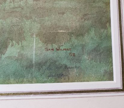Sam Wilmot (20th century) Watercolour "Captain Douglas Wills, Master of the Clifton Foot Harriers, Barley Wood Rington Somerset", hunting scene with huntsmen and hounds in foreground, signed and dated 58 lower right, 36.5cm x 48.5cm