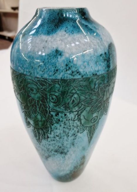 1930's Legras glass vase of tapering form, mottled blue/turquoise ground, stained etched floral band, 25.5cm high