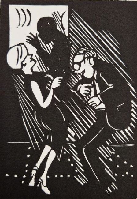 Nicholas Garland (British b. 1935)Linocut'Couple Dancing II', single linocut from 'Annabel's, The Complete Set of 14 Linocuts, 1985', signed in pencil lower right, titled and numbered 43/250, framed and glazed (has been cut down), published by Mark Birley, London, 33.5 x 24cm