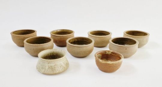 Seven similar studio pottery bowls, unmarked, a Paul Metcalfe studio pottery bowl (chips to top rim) and another studio pottery bowl unmarked (9)