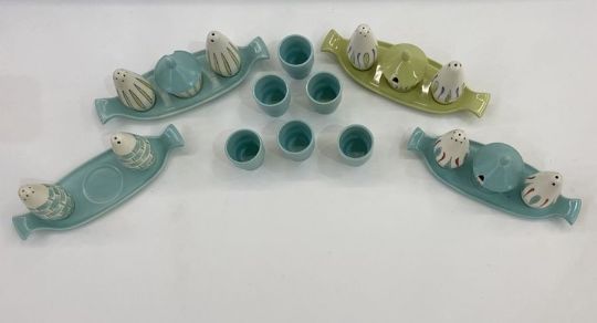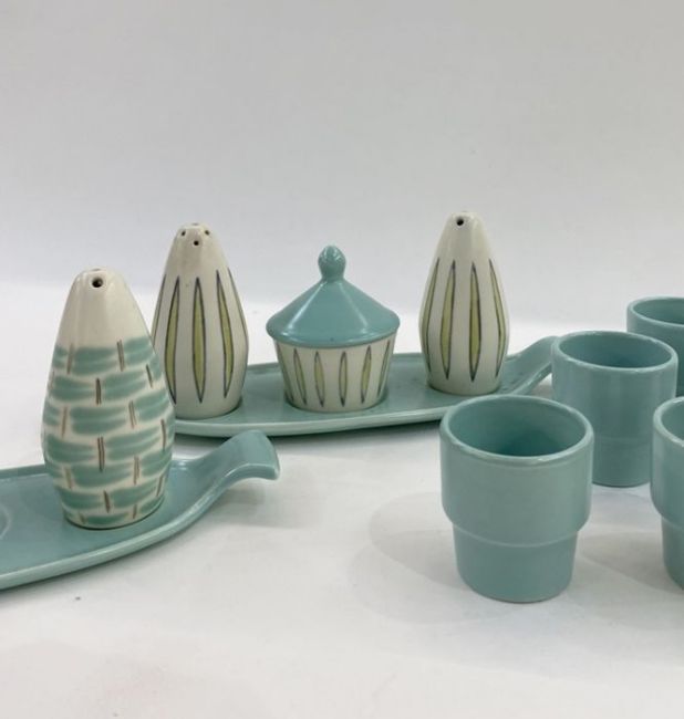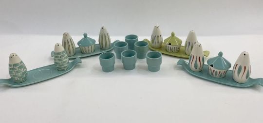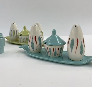 All items appear in good order, no visible chips, cracks or crazing, some general wear to bases (1 red stopper missing from pepper pot)