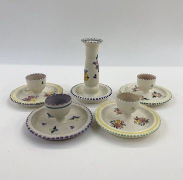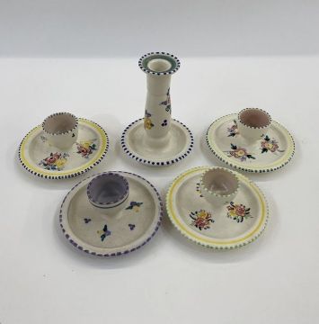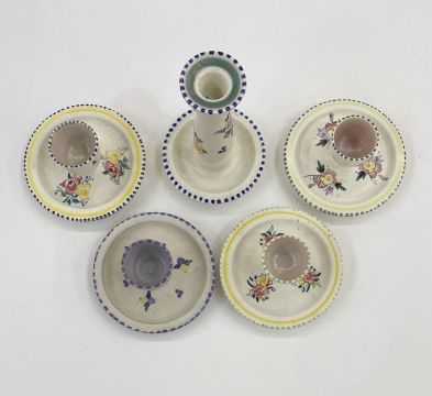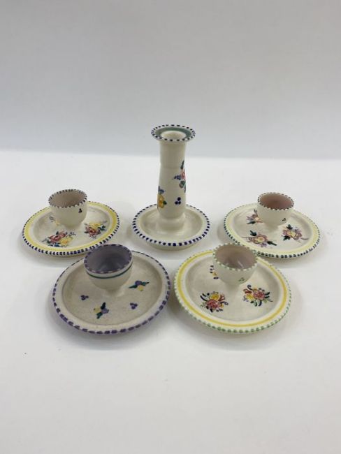 Poole pottery candlestick holder, no.168 to base and four various eggcups, one painted purple and yellow flowers (5)