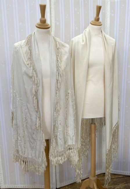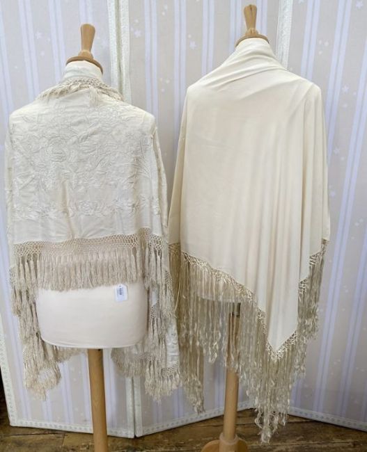 Chinese silk embroidered shawl, rectangular shape and a plain silk deep fringe shawl (2)