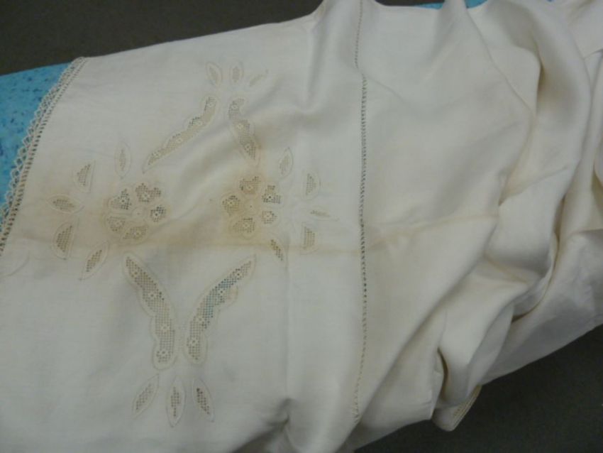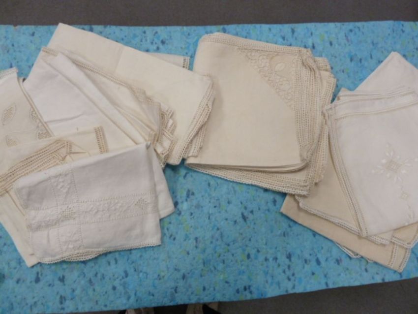 Quantity of linen, possibly Irish, to include three embroidered and two plain single sheets, four pillow cases. three handtowels, and twentyone napkins. There are some stains on the two sheets, and one pillow case