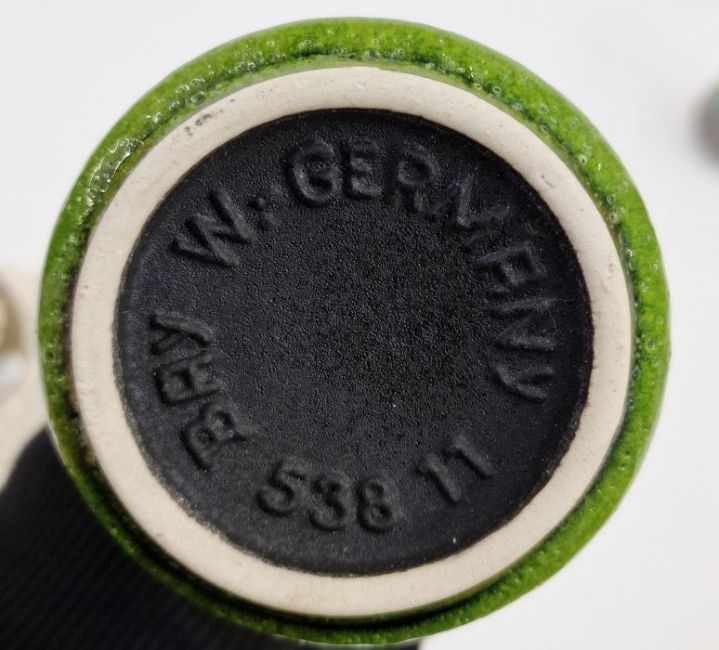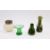 Loetz-style green glass vase, a Kralik glass vase with flower frog, another vase and a West German pottery green glass vase (4)