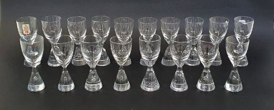 Set of eighteen Holmegaard "Princess" cordial/schnapps glasses designed by Bent Severin, the conical foot with an internal air tear rising to the conical flared bowl, some with etched mark to base (h. 9cm) (18)