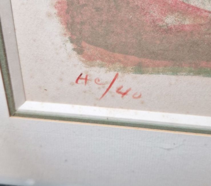 He???Colour lithographAbstract, black lines on green and pink background, indistinctly signed lower right, numbered HC/40, framed and glazed, 67 x 47cm