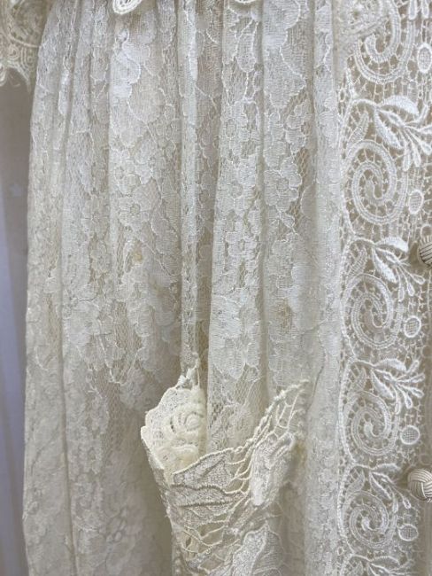 Coco Couture cream lace evening dress trimmed with lace, satin knot button fastening to the front, lace pocket, size medium, elbow-length sleeves, labelled 'Coco Couture'