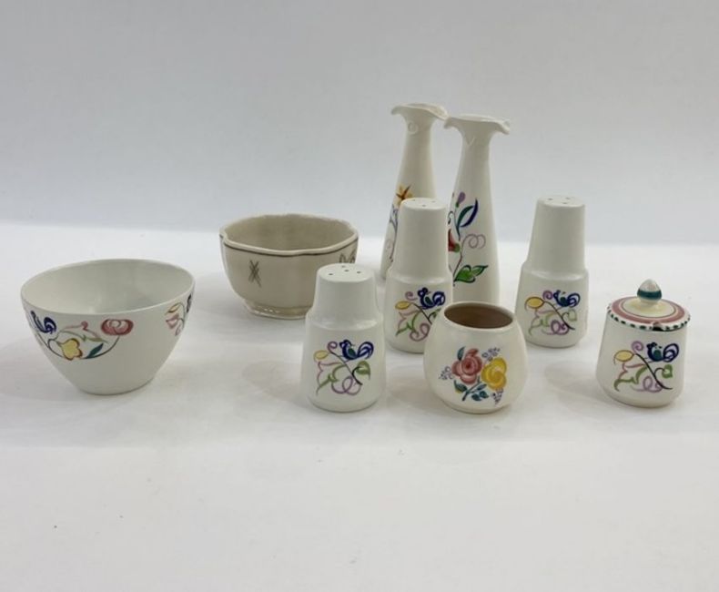 Poole pottery bowl initialled 'KV' to base, a pair of Poole pottery pepperettes, two tapered vases, a bowl and other items (9)