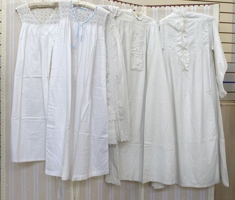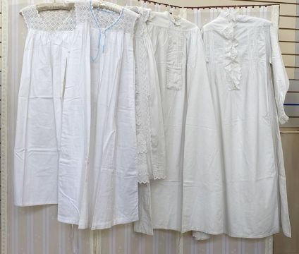 Full-length Victorian linen nightgown trimmed with lace on the bodice, sleeves and collar, a sleeveless Edwardian nightgown with crocheted bodice, single button fastening, another similar in poplin with blue ribbon thread through the crocheted bodice, another Victorian full-length nightgown (has been patched) with pintucks and broderie anglaise trimming to the neck and collar and a christening gown with broderie anglaise and white work detail (5)