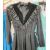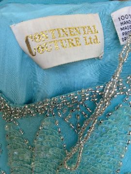 Possibly 1960's raw silk dress, V-neck front and back, empire waist with bugle beads and faux-pearl decorations to waist and neckline, three-quarter length sleeves, A-line (heavily altered and sleeves, trimmings and bits of material to go with it), a black velvet and lace dress labelled 'Jean Claire', size 38, frilled hem, velvet bodice with loop and button detail and matching velvet belt, a heavily embroidered dark turquoise evening dress labelled 'Serenade', size 14 and a chiffon and sequinned dress labelled 'Continental Couture Ltd', size 12 (4)