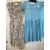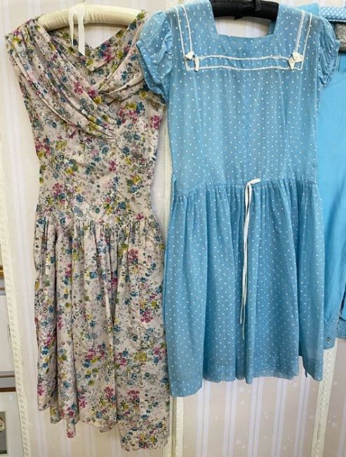 1950's printed nylon cocktail dress with ruched shawl collar, drop waist, full skirt, sleeveless, no label (tear under the left hand arm), a pale blue printed white spot 1950's party dress with puff sleeves, a blue linen dress and another pale blue linen cocktail dress with satin bow detail to the neck and back button fastening with white buttons (4)