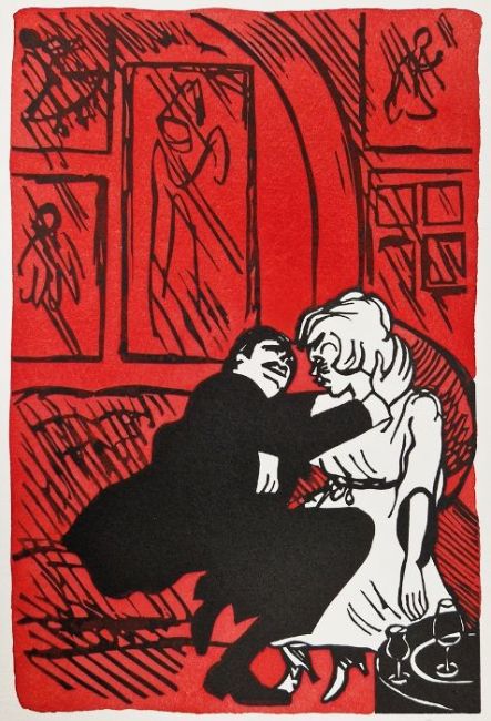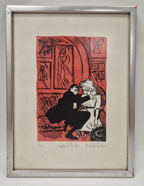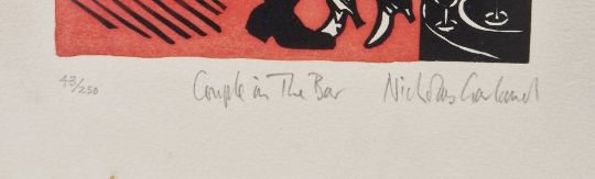 Nicholas Garland (British b. 1935)Linocut'Couple in The Bar', single linocut from 'Annabel's, The Complete Set of 14 Linocuts, 1985', signed in pencil lower right, titled and numbered 43/250, framed and glazed (has been cut down), published by Mark Birley, London, 33.5 x 24cm