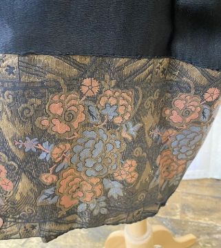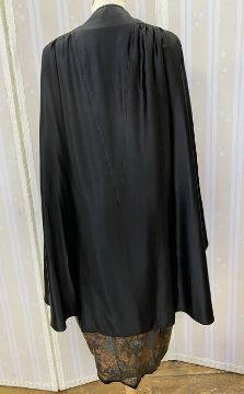 1920's black satin opera cloak with embroidered lame border (possibly continental), filigree brass-coloured metal buckle fastening