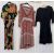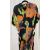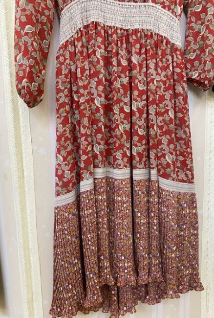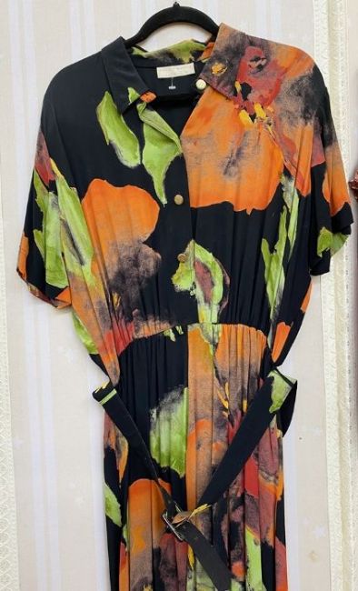 Mandy Marsh labelled shirt waist dress, bold orange and green patterns on a black ground, labelled size 18, brass button fastening to the front, with matching belt, a black lace and cotton cocktail dress labelled size 12, a Diane Fres nylon chiffon dress with crossover bodice, smocked elasticated waist, tiered hem, frill detail to the bodice and sleeves, another Diana Fres nylon chiffon dress embroidered with beads and sequins, smocked elasticated waist, full sleeves with a saff belt, another in cream with elasticated drop waist and a Luisa Spagnoli navy chiffon dress with pleated bodice and skirt, with lace trim and lace sleeves, button detail and pussy bowtie to the front, with original labels and spare button (5)
