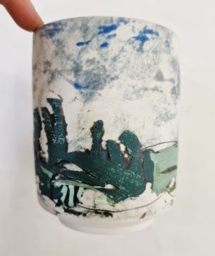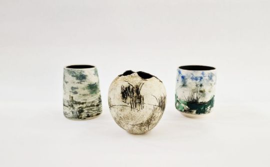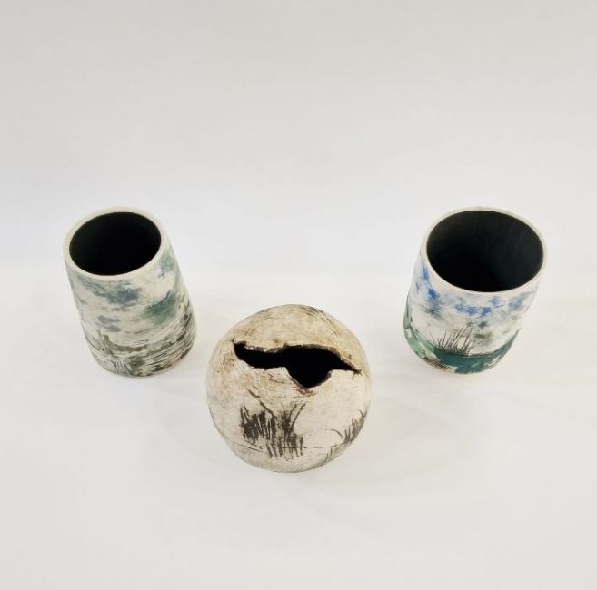 Peter Clough (b.1944) two grogged vases decorated with moorland landscapes, marked to base, both 13cm high approx. and another studio pottery vase, unmarked (3)