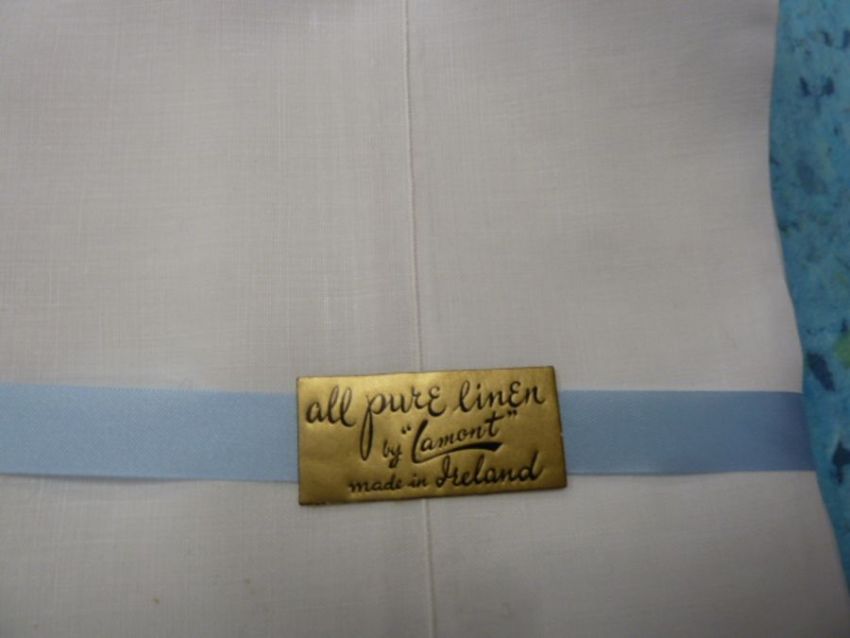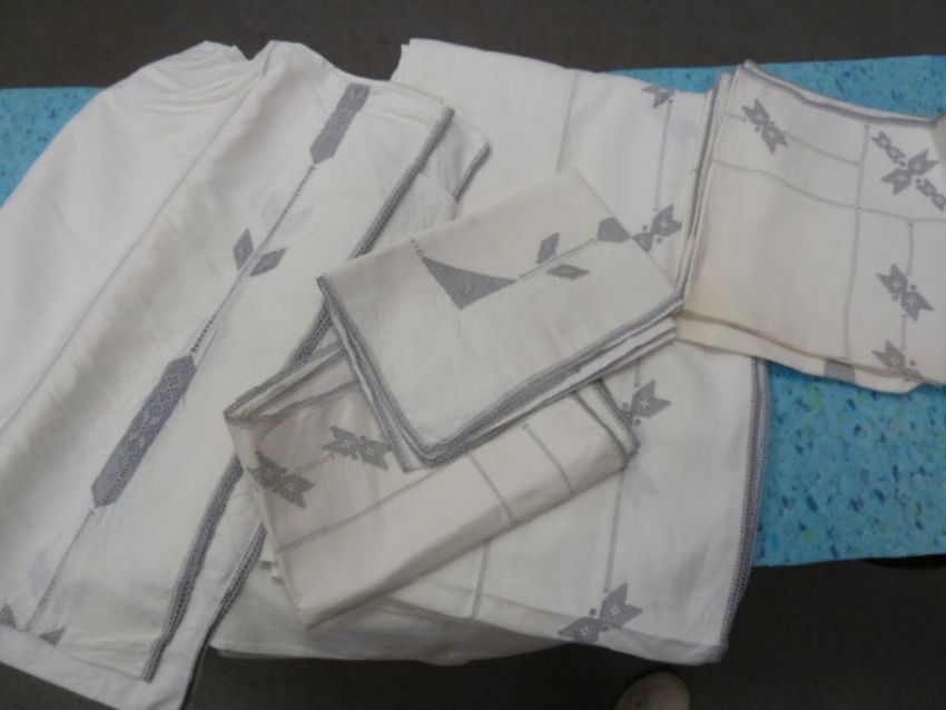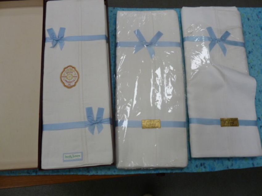 Irish linen single sheets - three pairs in original packing, and two single sheets with four pillow cases, embroidered and lace edging in grey