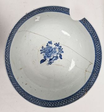 Chinese porcelain blue and white bowl, late 18th century, printed and painted with huts on islands, willow trees and pavilions, within cell and diaper pattern borders, the interior with a chrysanthemum flower spray, 32.5cm diameter (extensive damages and loss to rim)