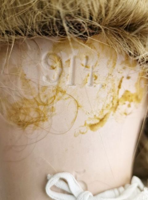 Bisque headed doll marked 'PM' and having blue sleeping eyes, open mouth, composition body, 71cm