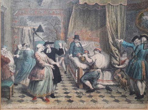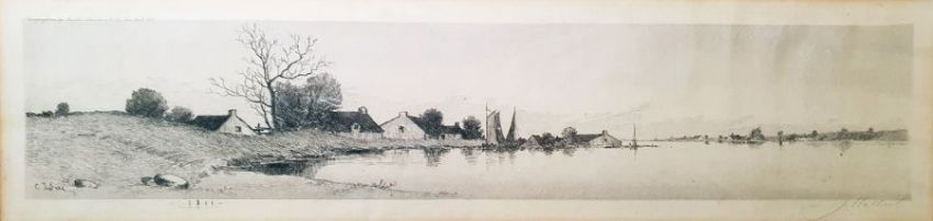 After E J Field Etching River scene, 10cm x 46cm After Louis De Surugue (1686-1762) Coloured engraving "Un Serrurier Coupe le Pot de Chambre pour Degager le Pied de Ragotin", 25cm x 35cm (2)