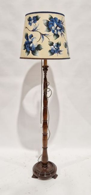 Turned wooden standard lamp with cream shade with blue painted flowers