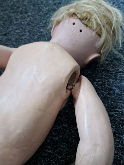 All dolls with surface scratches, marks, scuffs and stains. Some chips and cracks to the limbs on the three largest dolls. Baby head with hairlines. Loose joints on all with wear around joints. Areas of loss to hands and feet. General wear and tear. Biggest doll approx. 50cm tall.