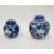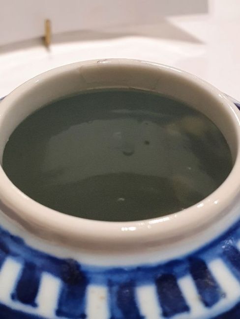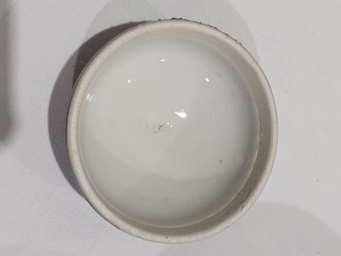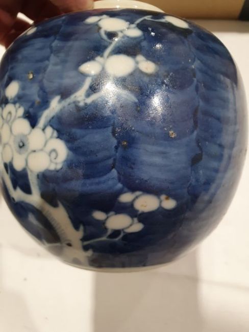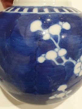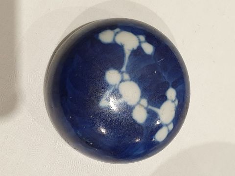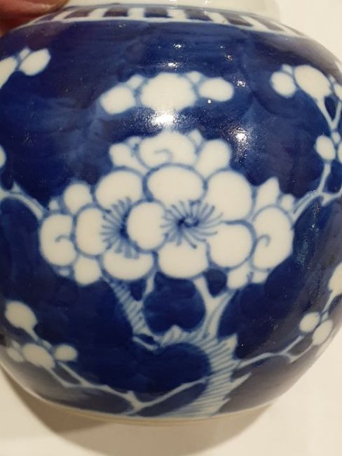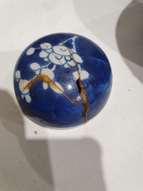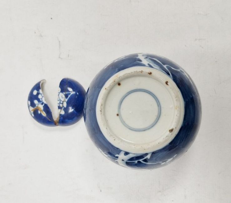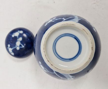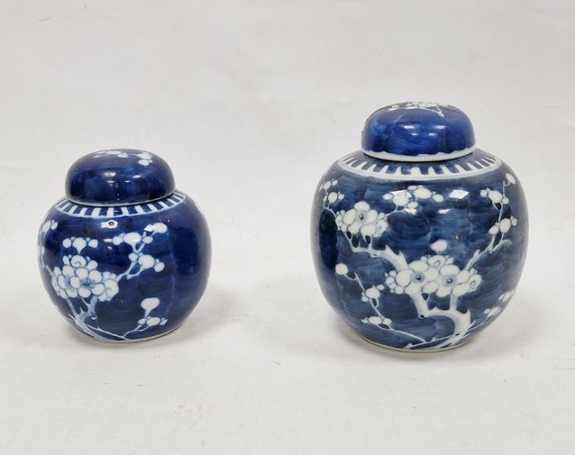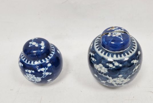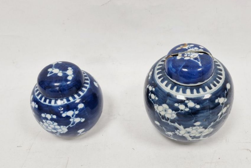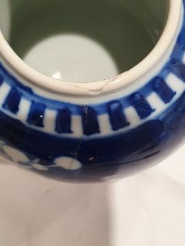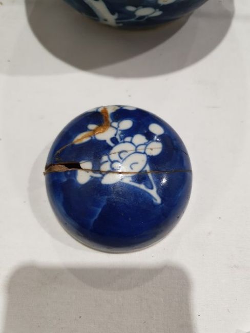 Larger jar with heavy damage and old repairs to the lid which is in two pieces. Light surface marks and accretions, pinholes and a small chip to the glaze on the body. Smaller jar with surface scratches marks, accretions and some pinholes to glaze. Chip and crack running from the rim down one side of the jar. General wear and tear.