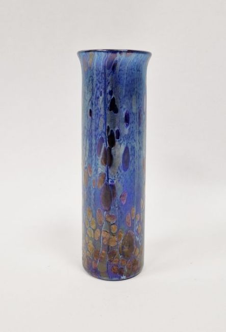 Loetz-style iridescent small cylindrical vase with flared rim, 13.5cm high