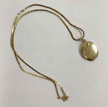 Modern 9ct gold oval mounted locket with engraved decoration, on a gold-coloured chain