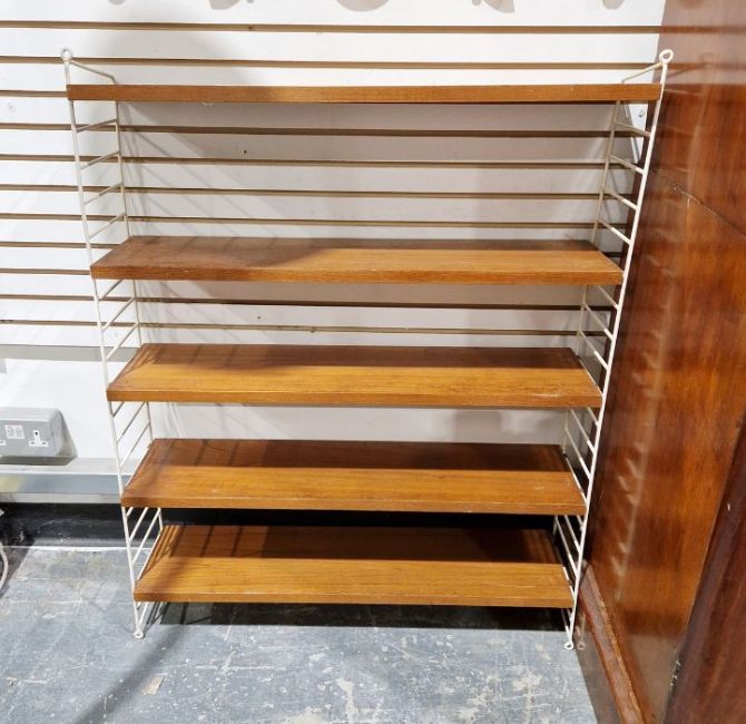 1960's/'70's String teak five shelf unit, supported by white metal laddered sides, (unstable, needs support), 98 x 80 x 20cm