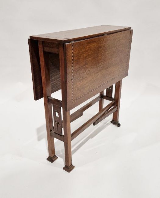 Early 20th century oak inlaid drop-leaf table with pierced stretchered base, on square feet and castors, 56cm