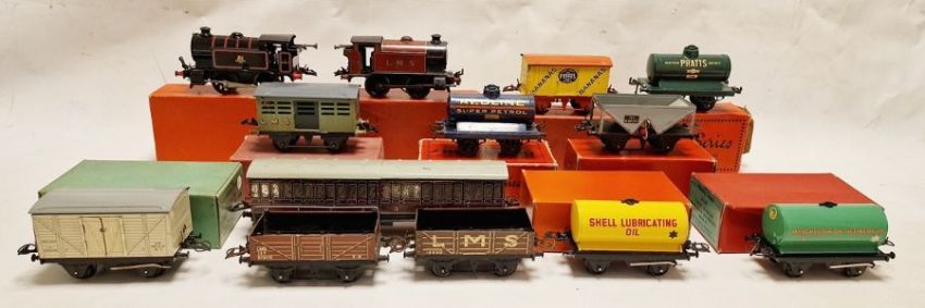 Quantity of Hornby 'O' gauge boxed and loose Railway to include LMS 2270 0-4-0 clockwork tank locomotive, British Railway 3 82011 0-4-0 clockwork tank locomotive, No.1 Banana van, Pratt's petrol tank wagon, no.1 cattle truck, etc (1 box)