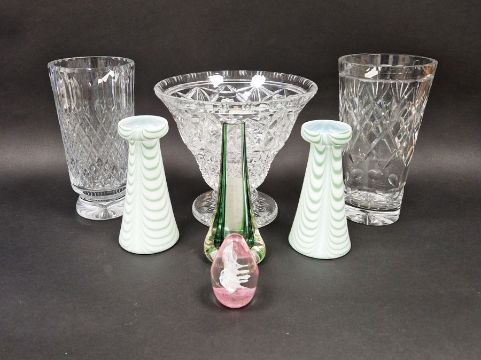 20th century Thomas Webb cut glass vase, 26cm high, a Caithness glass vase with blue and green swirls, a pair of early 20th century milk glass vases with green coloured drape decoration, a late 19th/early 20th century cut glass footed vase of conical form, 23cm high, a further 20th century cut glass vase and a glass paperweight (7)
