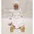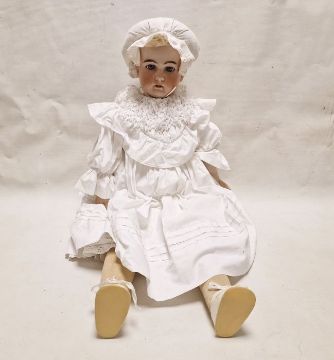 German doll with bisque head, sleeping blue eyes, open mouth and teeth, stuffed legs and body in a white bonnet, 84cm