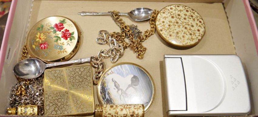 Quantity brass and metal items to include pair balance scales, brass Mr Punch doorstop, another in iron, a collection of compact mirrors, two stainless steel spoons and chains