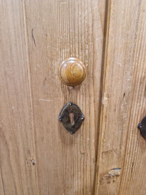 Early 20th century pine wardrobe with pair of cupboards, pair of drawers below, on bun feet, H. 188 x W. 115 x D. 59cmCondition ReportSurface scratches, scuffs and knocks to the wood. Light fading/discolouration. Split to the bottom left side, two splits to the right side. General wear and tear. All one piece, does not break down.H. 188cm, Depth 59cm