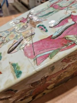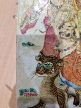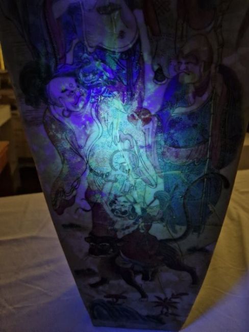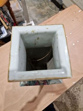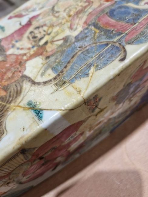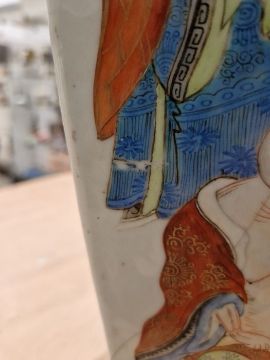 Second vase with surface scratches, accretions, wear to the gilt and decoration. Extensive damage and crude restoration to the body, general wear and tear.