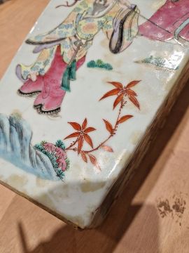 One vase with surface scratches, accretions, wear to the gilt and decoration. Crack to body spanning two sides, firing crack to base, general wear and tear.